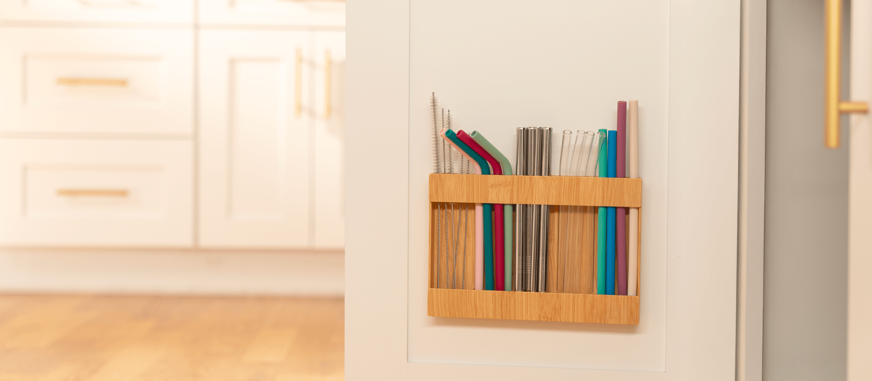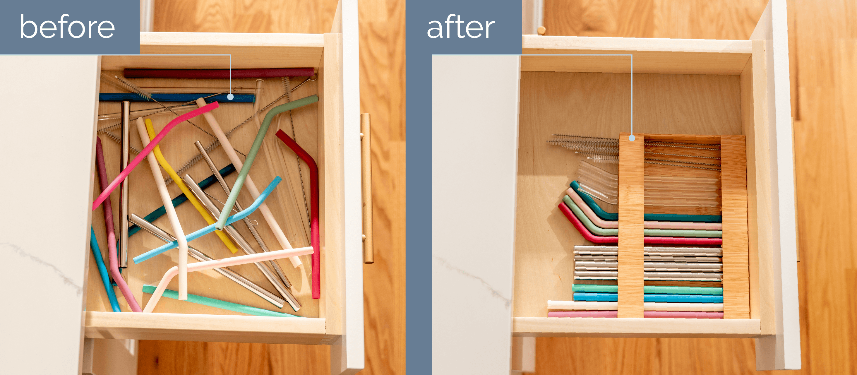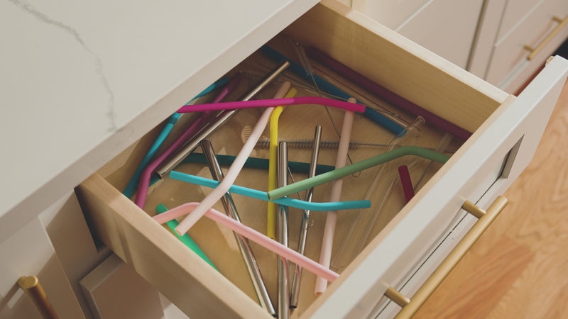 The straw organizer transforms messy cabinets, counters, shelves, or drawers into a clean, organized space!