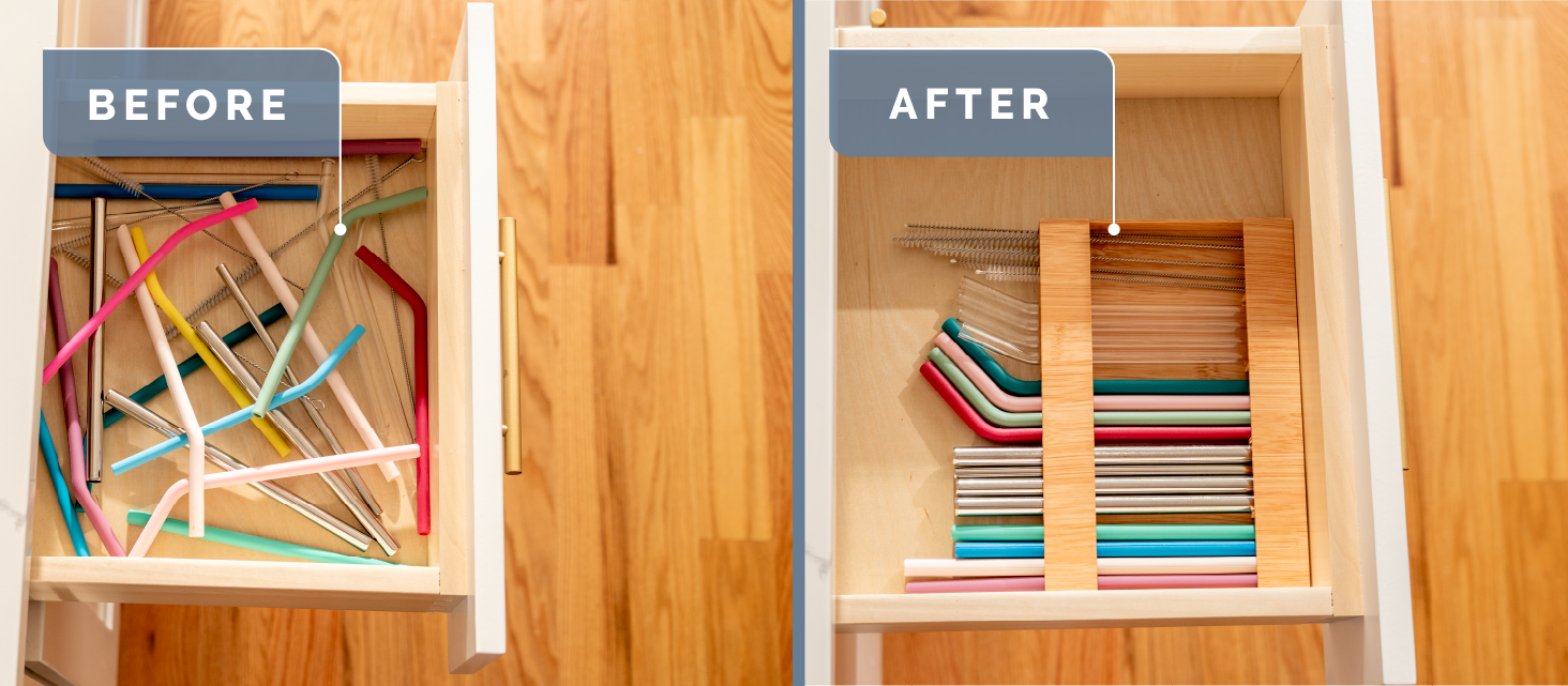 The straw organizer transforms messy and cluttered cabinets, counters, shelves, or drawers into a clean, organized space!