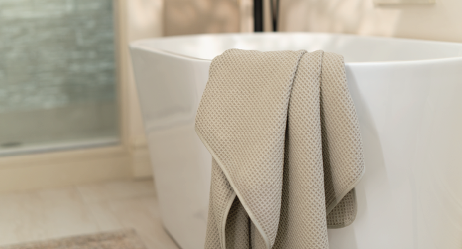 Combining high-end satin trim, a sewn-in hang loop, and super absorbent microfiber, the waffle bath towel offers both style and functionality.