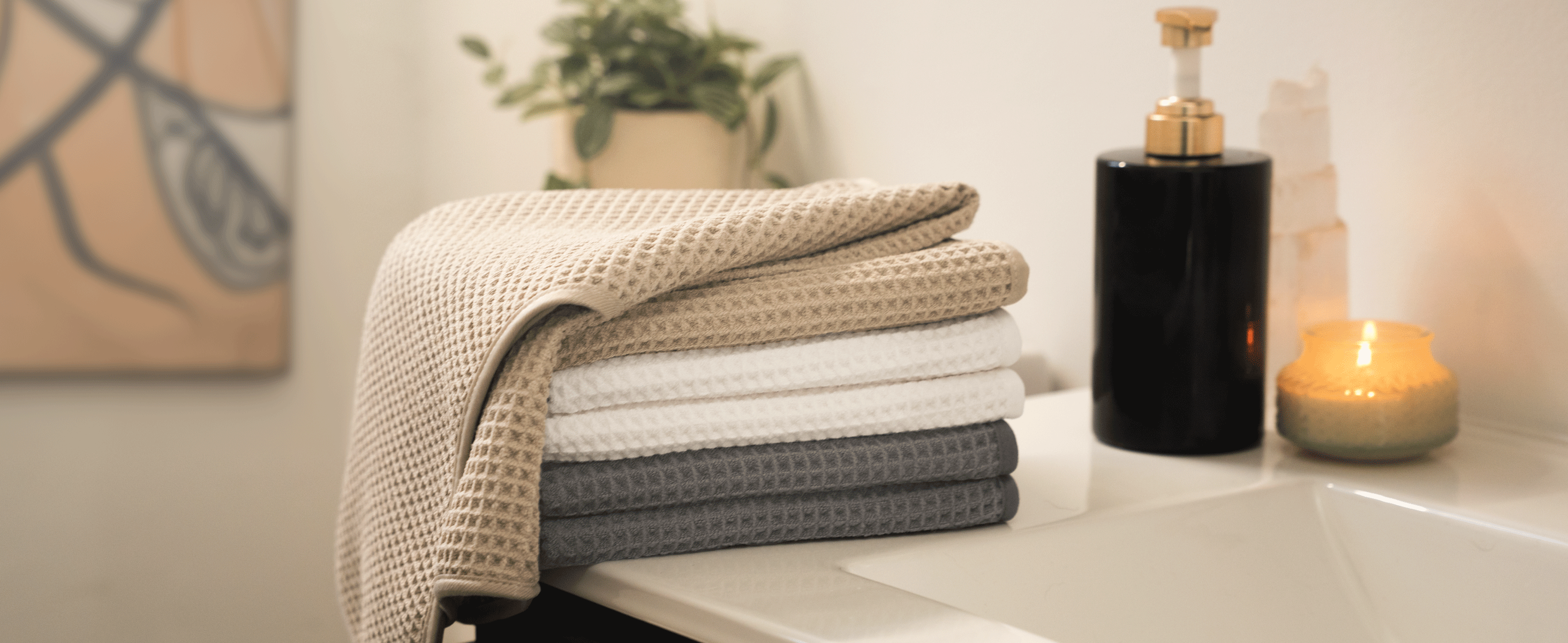 The best waffle hand towel comes in grey, white, or tan, making it easy to mix, match, and elevate the look of any bathroom.